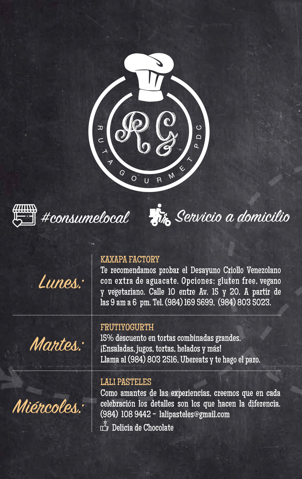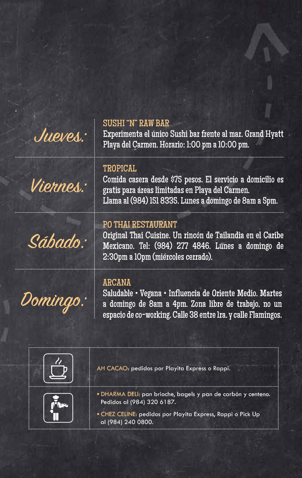 • CHEZ CELINE: pedidos por Playita Express, Rappi o Pick Up al (984) 240 0800.