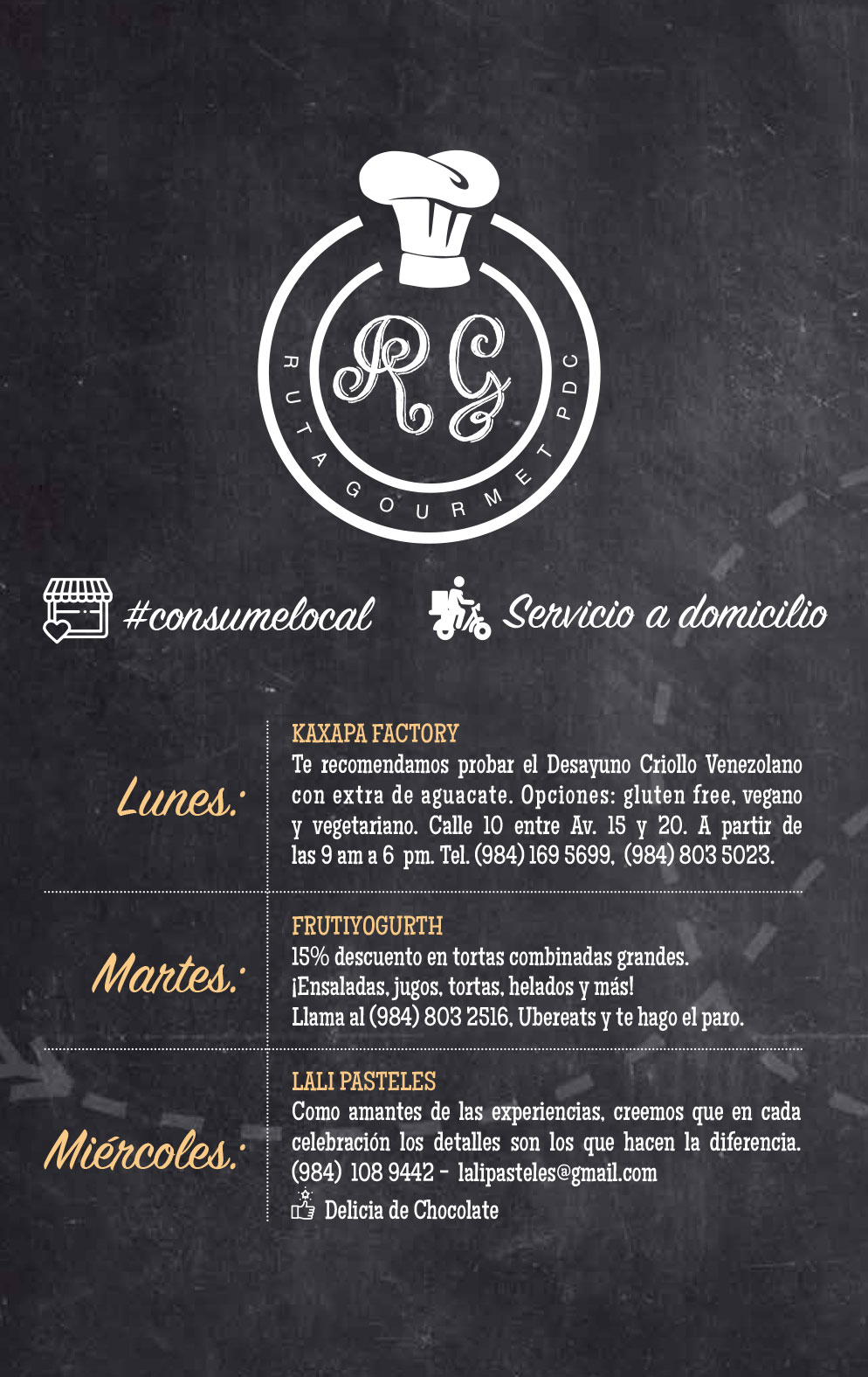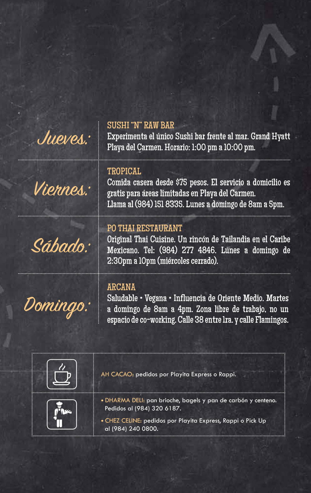 • CHEZ CELINE: pedidos por Playita Express, Rappi o Pick Up al (984) 240 0800.