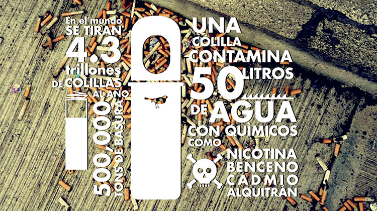 Una sola colilla de cigarro puede llegar a envenenar hasta 50 litros de agua, siendo el primer contaminante a nivel mundial, incluso por encima de las botellas de PET y bolsas de plástico, alcanzando cifras inimaginables de hasta 4,3 cinco trillones que son arrojadas cada año a las calles, ríos, bosques y playas con una “gravísima” repercusión en el medio ambiente.